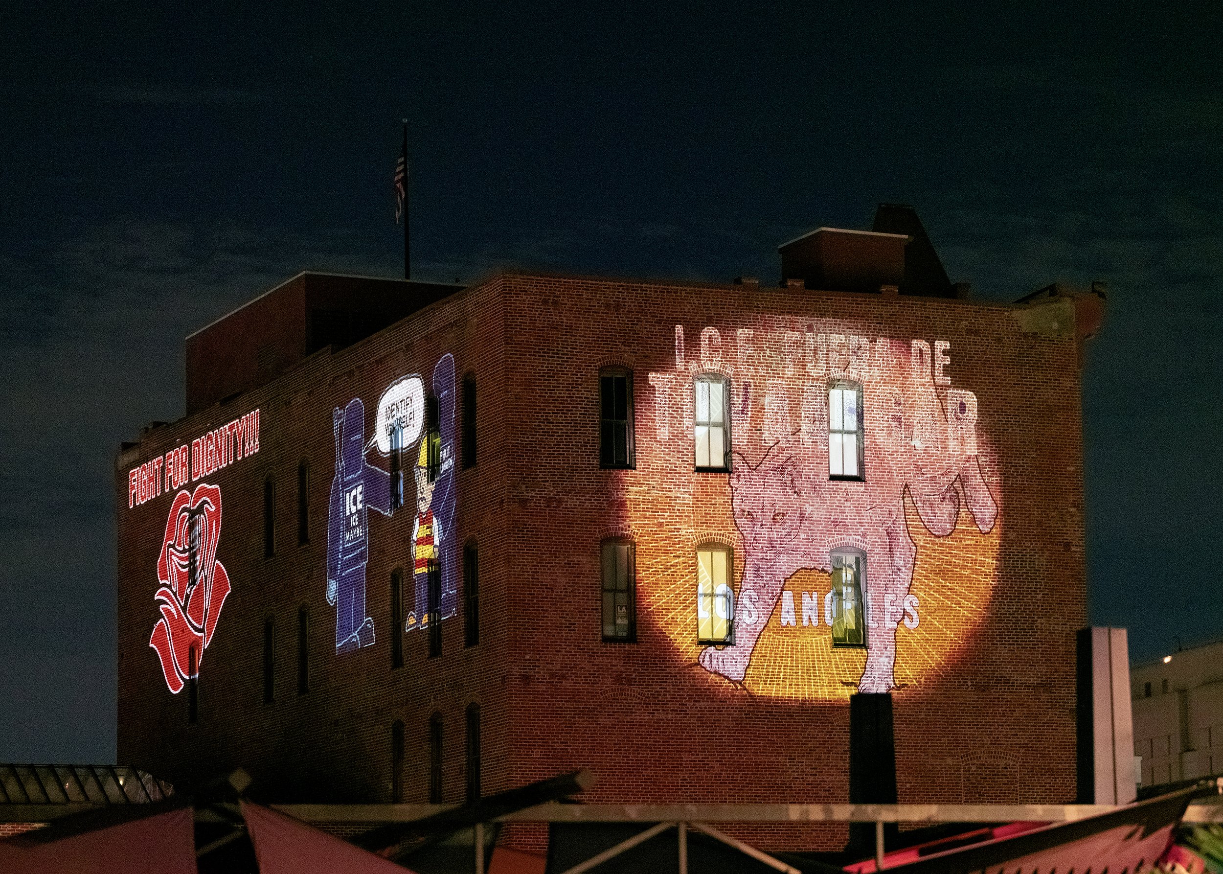 WE BELONG HERE is a public art project collaboration that harnesses the power of creative expression in partnership with local artists and institutions, transforming our campus into a vibrant canvas of resistance. Large-scale projections and neon signs displayed on LA Plaza’s exterior walls explore themes of the immigrant and undocumented experience, resilience, and call out the injustices affecting the communities of Los Angeles. The five partnering institutions are, LA Plaza de Cultura y Artes (LAPCA), California Community Foundation (CCF Headquarters), Social and Public Art Resource Center (SPARC), Japanese American National Museum (JANM), and the Museum of Latin American Art (MOLAA). Each site presents a distinct selection of images reflecting its own artistic and cultural perspective.